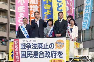 取手駅前で戦争法廃止の国民連合政府を求めるわが党の呼び掛けについて街頭演説。