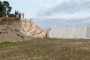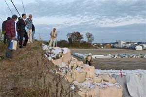 もともとの高盛りした自然地形が大きく削られたことがわかります。仮復旧の堤防ができていますが、低い高さでしかなく、本復旧の計画も未定。
