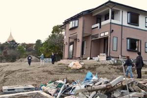 頭の高さまで水が来たこと、一階の家財道具は全部駄目になり、いまなお住める状態にないこと、自動車や農機具も使えなくなったことなど、暮らしの見通しが立たないことを訴えていました。すぐ隣には土台から大きく傾いた住宅も。