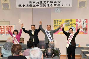 つくばみらい市の演説会に出席。2月7日投票のつくばみらい市議選は、古川よし枝市議と柿沼ともゆきさん(川上文子市議からバトンタッチ)の2人をめざします。小林きょう子参院茨城選挙区予定候補も一緒です。