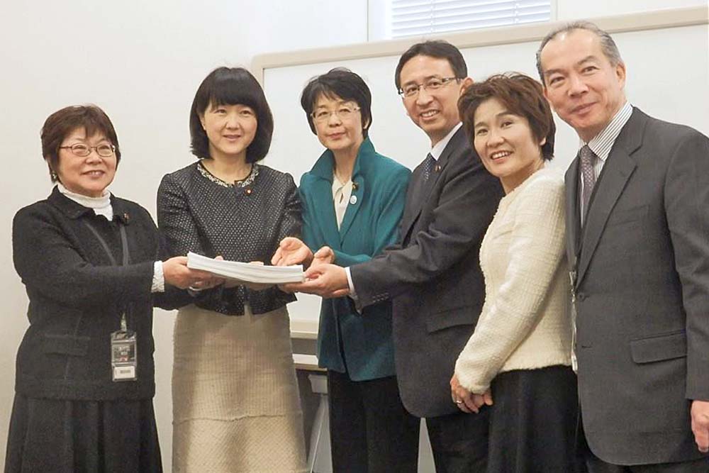 紙とも子参議院議員、梅村さえこ衆院議員とともに、総数33,319筆の署名を受け取りました。おくだ智子さん、伊藤岳さんが同席。