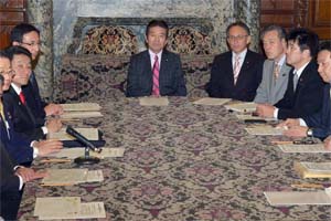 衆院選挙制度をめぐり、大島理森衆院議長は全党を呼び、意見交換会を開き、穀田恵二国対委員長とともに出席。