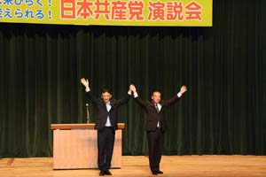 蕨市の党演説会。伊藤岳参院埼玉選挙区予定候補と一緒に訴えました。