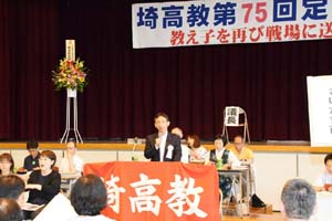 埼高教定期大会に出席し、あいさつしました。「教え子を再び戦場に送るな」というスローガンが、今ほど重みを持っているときはありません。