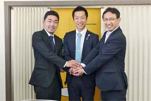 堀越さんは作業療法士。医療や介護など社会保障の拡充の政策を大事にしています。選挙区から新たに比例で奮闘する伊藤達也(写真左)さんと三人で、参院選勝利めざし固い握手。
