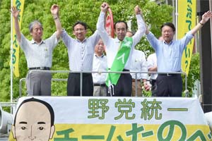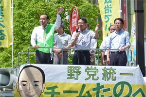 宇都宮市二荒山神社前。野党統一のたのべたかお参院栃木選挙区予定候補の合同街頭演説会で訴えました。県民ネットワーク代表のあいさつの後、民進党・日本共産党・社民党・新社会党の代表が訴え。