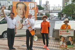 所沢駅西口。梅雨空を払う伊藤岳参院埼玉選挙区予定候補の訴え。足を止め、聞き入る人も。