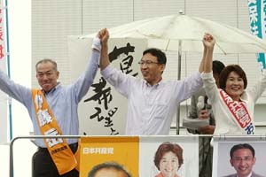 浦和駅東口、参院選公示第一声。伊藤岳埼玉選挙区候補、おくだ智子比例代表候補が迫力ある訴え。