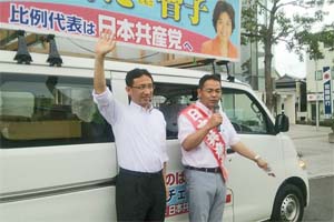茨城県筑西市内で街頭演説。上野高志県議らと一緒に、日本共産党への支持を訴えました。
