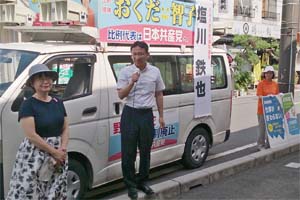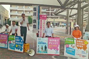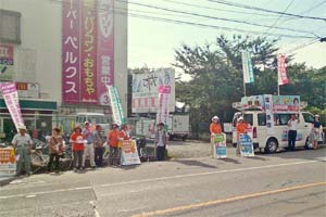 草加、越谷市内で街頭演説。暑い日差しの中で、勢いのある宣伝行動。