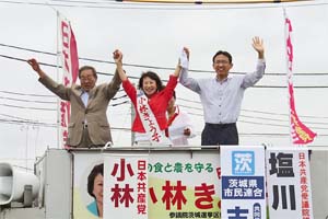 茨城県つくばみらい市で、小林きょう子選挙区候補と訴え!茨城県市民連合の市川紀行・元美浦村村長が応援演説。「安倍暴走政治とめるため、共産党と小林きょう子必勝を!」。