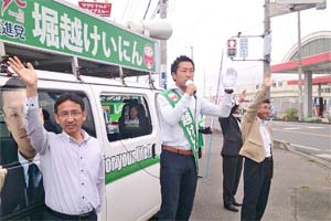 堀越けいにん候補は「憲法を壊す安倍暴走政治は許せない。軍事大国ではなく福祉大国の日本を実現しよう!」と呼びかけ。通りすぎる車から次々と声援が寄せられます。何としても勝ち抜こう!