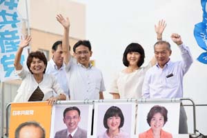 伊藤岳さん、おくだ智子さん、梅村衆議院議員と、浦和駅東口で参院選報告の街頭演説。司会は村岡県議です。