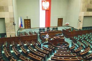 写真は、ポーランド下院本会議場。下院(セイム、任期4年)は定数460名。選挙制度は全国を46に分けた比例代表制。得票率5%以上の足切り条項があります。選挙権は18歳以上、被選挙権は21歳以上(下院)。与党は「法と正義(PiS)」233議席、主要野党に市民プラットフォーム(PO)138議席、クキズ'15が36議席など。