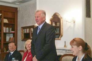 シュミット・パール ハンガリー元大統領と懇談。政権与党のフィデス所属の国会議員として、国会議長を務めた後、ハンガリー大統領に。フェンシング元世界チャンピオン・五輪金メダリストです。婦人のカタリン・マクライさんは、東京オリンピックで段違い平行棒の銀メダリスト。シュミット氏は、2024年オリンピックのハンガリー招致委員会委員長でもあります。1964年及び2020年の東京オリンピックの話やスポーツ振興、ドーピング問題など懇談。