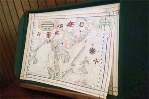 | 1571年に作成された世界地図。東南アジア、北東アジアが記載されている一枚。右上に日本がありますが、変な形です。地図には金箔が貼られていたり、カラフルな色彩となっており、実用というより、美術品としての性格を持っていたようです。 |