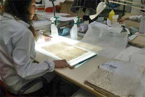 ポルトガル公文書館における古文書の修復作業。虫食いなど傷んだ古文書の修復には、日本の和紙が欠かせません。