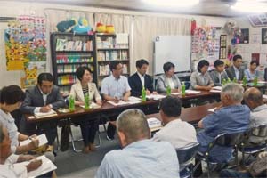 遠藤・石川両党町議が同席。遠藤町議は「農作業で使っているような庭先でも、地目が山林だと除染の対象にしなかった。とんでもない」「国は町道の復旧は町でやれというがおかしい。避難している住民は道路を使っていない。除染作業の車両によって町道が傷んでいる。国の責任で直せ」と話していました。