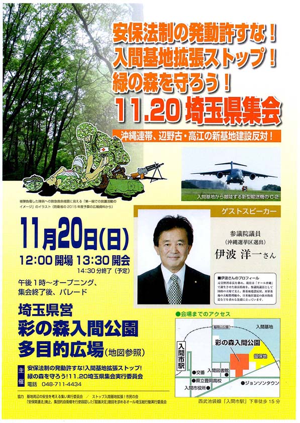 『安保法制の発動許すな・入間基地拡張ストップ・緑の森を守ろう「11・20埼玉県集会」』を11月20日(日)午後1時半から彩の森入間公園で行います。