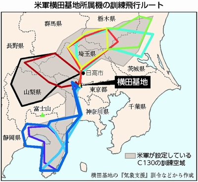 飛行ルートは、東京、神奈川、埼玉、茨城、栃木、群馬、山梨、静岡、長野の9都県に及び、13年4月に横田基地で開かれた空中衝突防止会議で明らかになったC130輸送機の低空飛行訓練空域の範囲とほぼ一致しています。