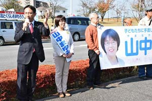 | つくば市議選の山中まゆみ候補の応援演説。田中サトエ市議の仕事をバトンタッチしてがんばります!つくばエクスプレス(TX)沿線は人口増加中。市民のためのインフラや医療・教育施設整備が遅れています。「産婦人科・保育所を増やそう」と訴える山中まゆみ候補。3人の子どもの母親として、子育て世代の願いをしっかり受け止め、まっすぐに市議会に届けます。 | ![]() |
