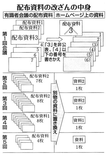 改ざん・ねつ造が判明したのは、同会議の1~5回目の配布資料(図右)。塩川議員が請求、入手した配布資料を調べた結果、わかりました。