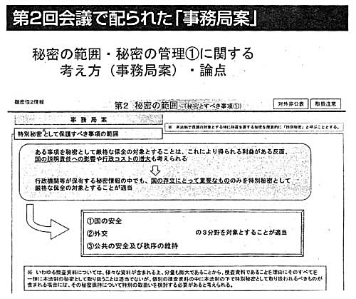 2~5回目の会議は、秘密の範囲や罰則など法制の具体的な中身について議論した回です。政府は各回で、4~8枚の資料を「事務局案」として配り、詳細に「論点」を提示(下図)。しかし、官邸ホームページで公開したのは、見出しだけを記した1枚の、全く別物の資料です。