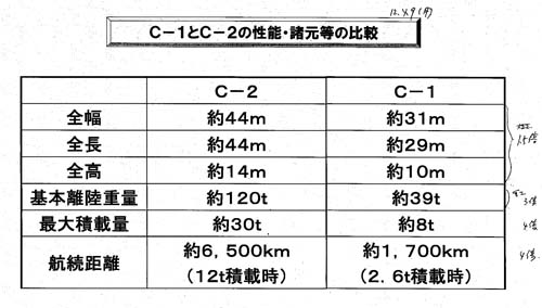 C2はC1と比べて、大きさは1.5倍、重量は3倍、最大積載量と航続距離は4倍になる(資料1。防衛省提出資料。以下、資料4・5を除き、防衛省提出のもの)。23中期防(平成23~27年度中期防衛力整備計画)においては、C2を10機整備することとされている。予算措置として23年度2機(374億円)、23年度4次補正2機(290億円)、24年度2機(329億円)。すでに予算措置された6機はすべて美保基地に配備される。26年度に1機、27年度に3機、28年度に2機を予定。