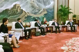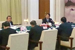 日中議会交流委員会派遣衆議院代表団(佐藤勉団長)は、張徳江全人代常務委員会委員長(国会議長)と会見。 |