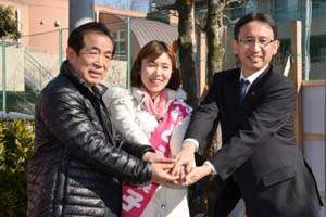 もちづき久晴・戸田市議(左)からバトンタッチをめざす、むとう葉子候補(中)と