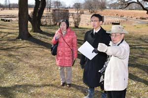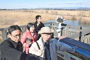 栃木・群馬・埼玉・茨城の4県にまたがる渡良瀬(わたらせ)遊水地。渡良瀬川、思川(おもいがわ)、巴波(うずま)川が合流する位置にあり、ヨシ原などの湿生草原を有する総面積33k㎡の遊水地です。ラムサール条約登録湿地となって今年で5年になります。野村節子栃木県議と一緒に、「谷中村の遺跡を守る会」の高際澄雄会長(宇都宮大学名誉教授)の案内で視察しました。 |