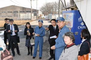 調査には村岡県議、前原県議、三芳町議団、所沢市議団が参加。倉庫から数十メートルのところに自宅がある方は「火がどんどん広がるのを見て防火シャッターが機能していないなと感じた。240m×100mの建物だと中までホースの水が届かない」と建物の構造上の問題点を指摘していました。 |
