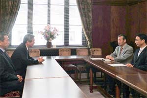 自民党の竹下国対委員長と小此木国対委員長代理が、今村復興大臣の「大震災『東北でよかった』」との暴言について、日本共産党控室を訪れ、謝罪。日本共産党から穀田国対委員長と私が応対しました。