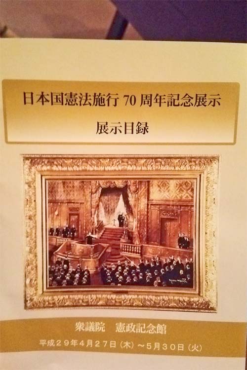 | 衆議院憲政記念館では日本国憲法施行70周年記念展示が行われています。衆議院、貴族院の審議を通じて、原案に修正が加えられたことがわかる「帝国憲法改正案貴族院回付案」(衆議院議事部所蔵)も展示されています。 | |