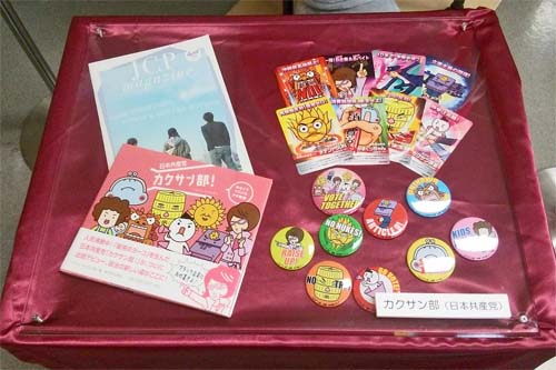 憲政記念館では各党の宣伝用資材が展示されていました。日本共産党の「カクサン部」のグッズもあります。 |