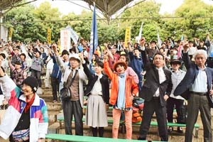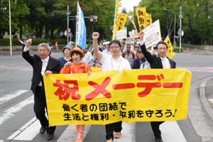 所沢メーデー集会で、団結ガンバロー!。続いてパレード。