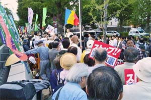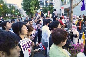 議員会館前の抗議集会に参加。社民、共産、民進、自由の各党代表があいさつ。わが党は藤野衆院議員が本会議場で反対討論を訴えた熱い思いで、ボロボロとなった法案の内容を告発し、廃案めざして全力を挙げることを決意表明。