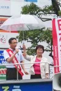 江戸川区内で河野ゆりえ候補の応援に。大橋みえ子区議と訴えました。