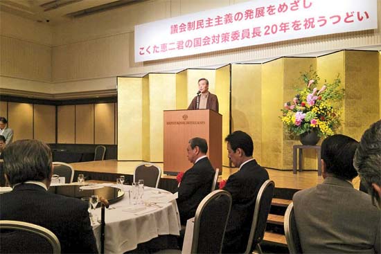 「議会制民主主義の発展をめざし、こくた恵二君の国会対策委員長20年を祝うつどい」が30日、京都市内で開かれ、自民党から共産党まで与野党の政治家や京都の各界各層の代表ら約300人が出席しました。