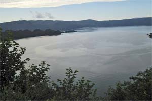 | 十和田湖を臨む。十和田火山の噴火によってつくられた二重カルデラ湖です。 327mの水深は、国内で3番目の深さ。 |