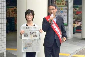 航空公園駅東口で、城下のり子所沢市議、党後援会の皆さんと一緒に朝の宣伝行動。