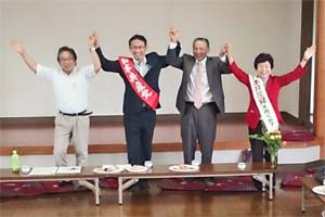 坂東市の日本共産党報告会。藤野稔市議、大内くみ子比例予定候補、石嶋いわお茨城7区予定候補と訴えました。
