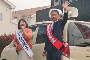 スーパー前で訴えていると、通りかかる人がたくさん、手を振って応援してくれます。