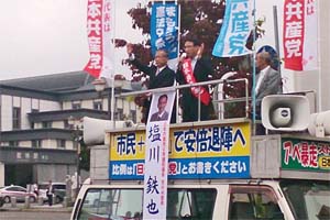 館林駅前で街頭演説。渋沢哲男党東毛地区委員長と訴えました。