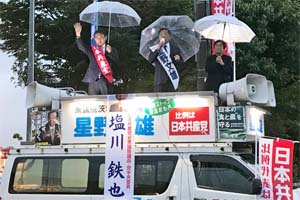 茨城町のスーパー前で、星野文雄茨城2区候補と宣伝行動。