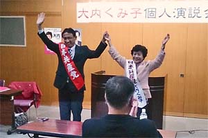 水戸市内で演説会。大内くみ子比例候補(茨城1区重複) と訴えました。