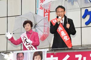 朝から冷たい雨が降り続くなかでも、支持者が演説場所で待ち受け、「8時間働けばまともに暮らせる社会を」「消費税10%NO!」などの大型プラスターを掲げ、道行く車や買い物客などにアピールしました。