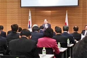韓日議連の姜昌一(カン・チャンイル)会長は、両国関係が冷え込んだ時期も議連がかけ橋として努力をしてきたことを指摘。「両国の友好増進と協力体制は両国や両国国民のみならず北東アジアの平和と繁栄に大きく寄与する]と述べました。