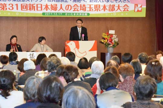 日本共産党の塩川鉄也衆院議員が来賓あいさつし、埼玉では市民と野党の共闘を前に進めようと、女性の市民連合が全国に先駆けて発足したと述べ「平和を願い、暮らしを守る埼玉の女性のみなさんの運動が力を発揮しています。ご一緒に頑張りましょう」と呼びかけました。