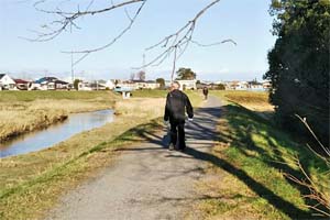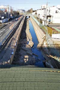 | 新河岸川右岸の堤防。ポンプ車が進入できるように、拡幅・舗装が行われる予定です。 | ![]() |